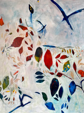 I like this style of painting and it fits my mood at times. Let me explain... the process begins with an abstract painting that is built up with layers of colors, marks and papers. Once I decide to create this style, I will look at the painting from many angles, looking for a shape that is interesting enough to keep! I start by painting around that shape with a mix of titanium white and an off-white like parchment or unbleached titanium. Once I find one shape, the next one is easier to find. I always leave more shapes than I think on my first round. The white/off-white paint needs a few coats to cover the layers beneath. How does this fit my mood? Well, the pace of this is pretty slow and it reminds me of doodling while I'm on the phone, usually on hold. Do you do that? It's kind of thoughtless but you're still creating. Sometimes I'm just in that mood.
